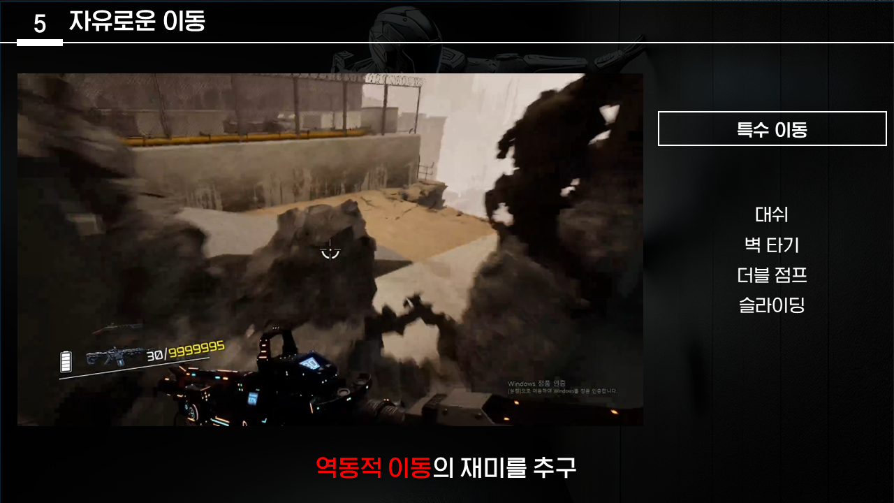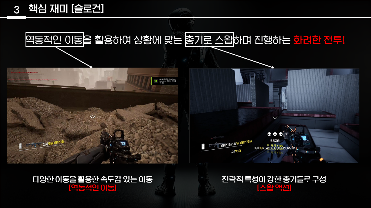 역동적으로 이동하며 상황에 맞는 다양한 총기를 활용하며 진행하는 화려한 전투가 [SECOND WAR]의 게임 포인트입니다.