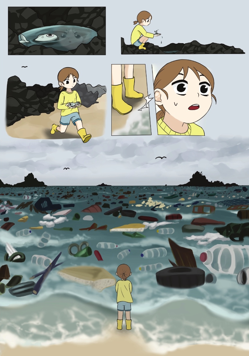 여자아이가 얕은 물에서 죽어가는 물고기를 다시 바다에 돌려놓으려고 했지만, 바다는 이미 생물이 살기 힘들 정도로 온통 쓰레기로 뒤덮여버렸다. 해양오염을 적극적으로 해결하려고 하지 않는 이상 여자아이가 보고 있는 이 바다를 언젠가 우리가 마주하게 될 수도 있겠다고 생각했다.