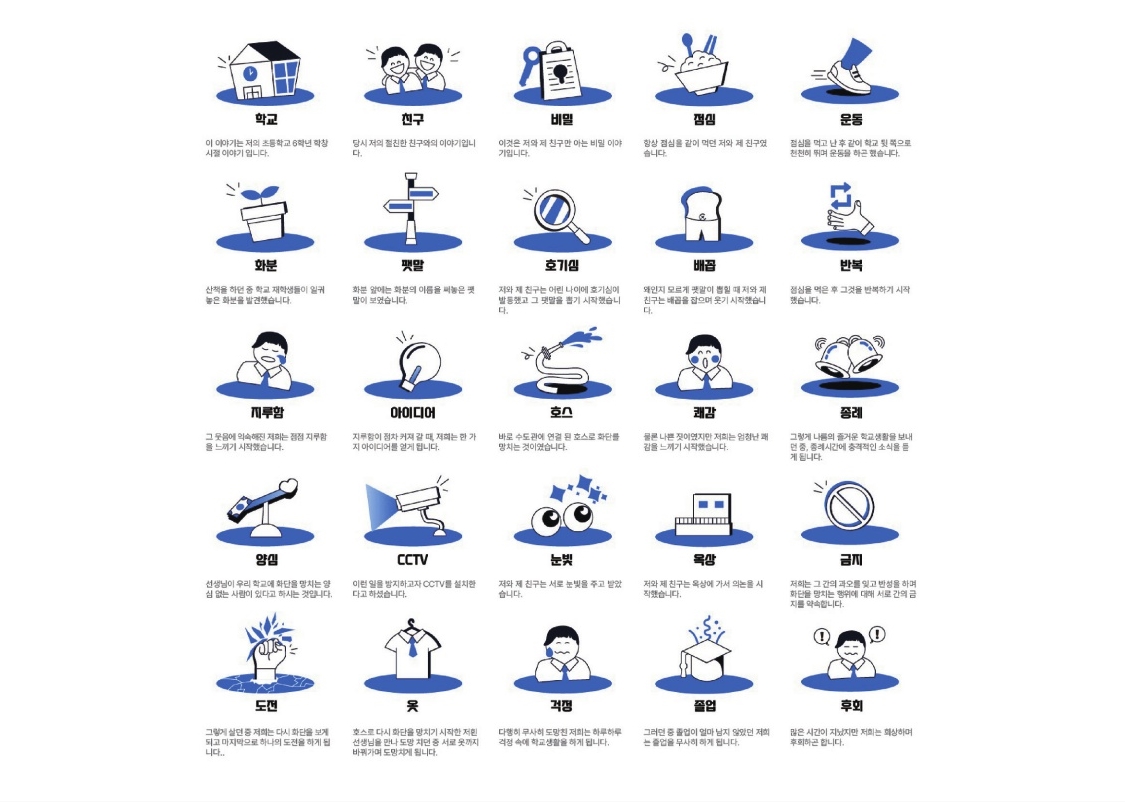 작품 설명 : 학창 시절 악동 같았던 제 이야기를 25개의 픽토그램으로 시각화 해보았습니다. 악동이라는 것에 맞게 픽토그램의 스타일을 귀엽고 개성있게 제작했습니다.
