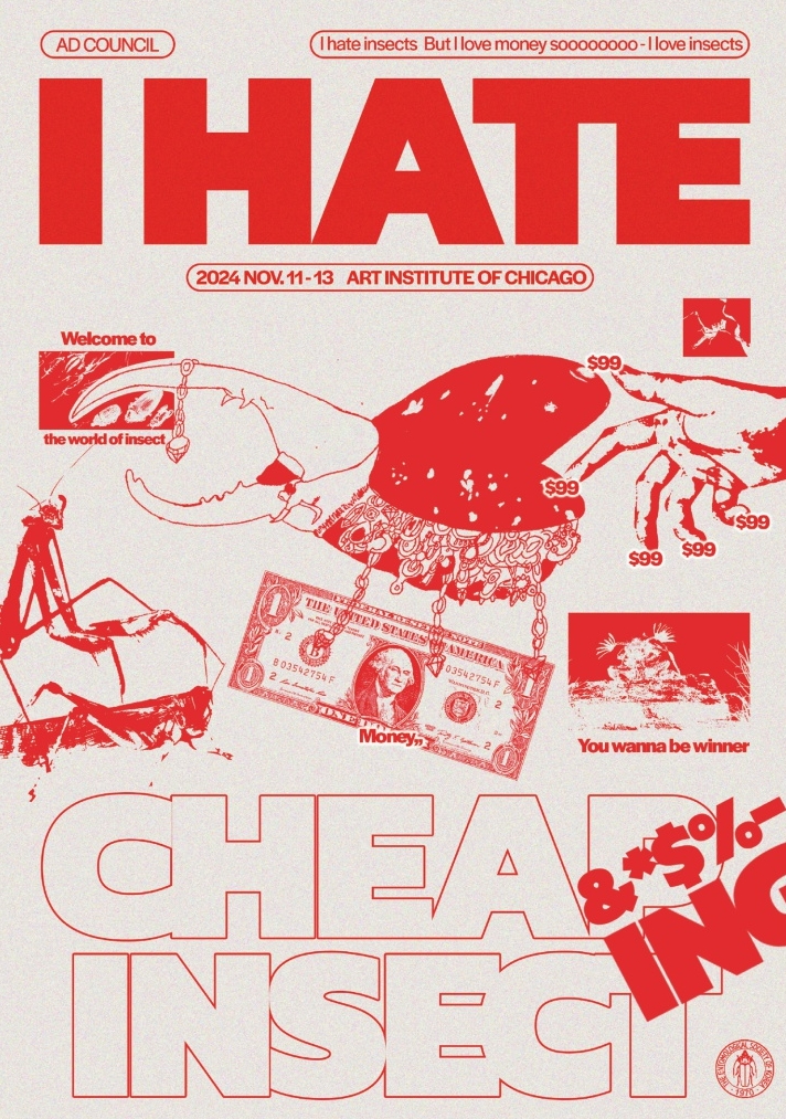 펜 작업을 한 풍뎅이가 돈을 든 채로 날아다니는 모습을 센터에 배치하고 그 옆으로 그것을 사려는 손과 다른 곤충들의 모습 등 서브 오브젝트를 배치했습니다. 메인 텍스트는 곤충은 싫어하지만 돈을 쫓아 곤충을 좋아하는 사람들의 이중적인 마음을 담았습니다. 전체적인 색감을 투 톤으로 디자인했습니다.