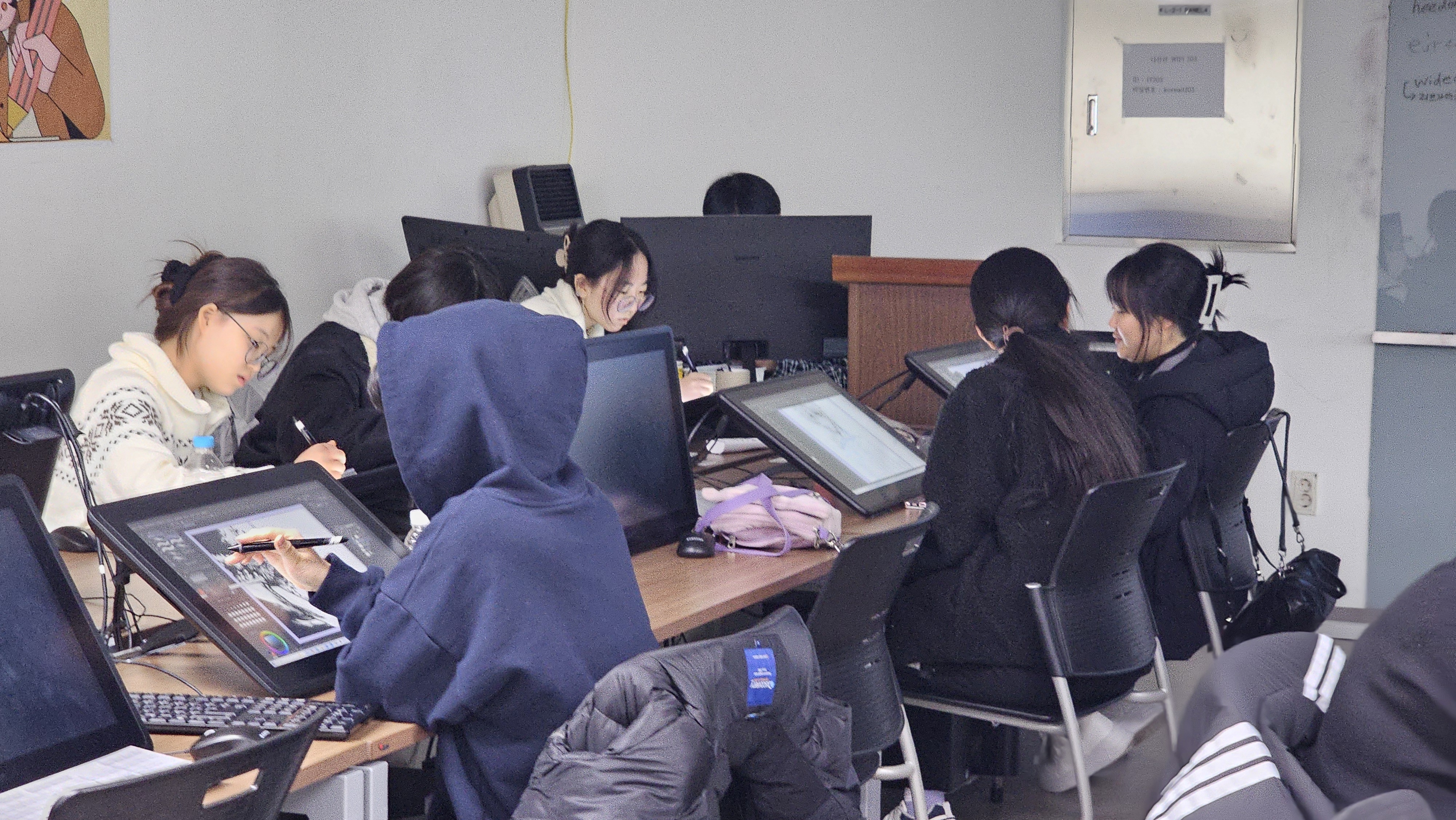 이번 진로캠프 프로그램에서는 학생들이 와콤 신티크 22 액정 타블렛을 사용할 수 있는 웹툰 창작 스튜디오와