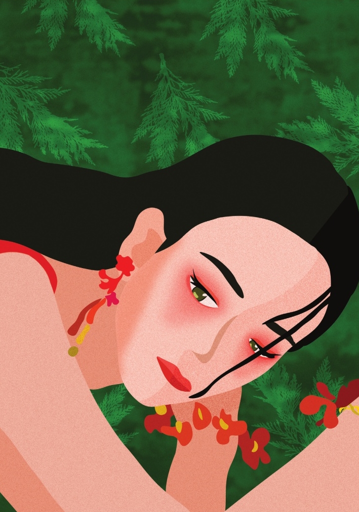 작품 설명 : 블랙핑크 지수 '꽃' 앨범의 컨셉 포토를 펜툴 그림으로 재해석한 작품입니다. 대비색 초록과 빨강을 메인 컬러로 잡았으며 동양적인 느낌을 표현하였습니다.