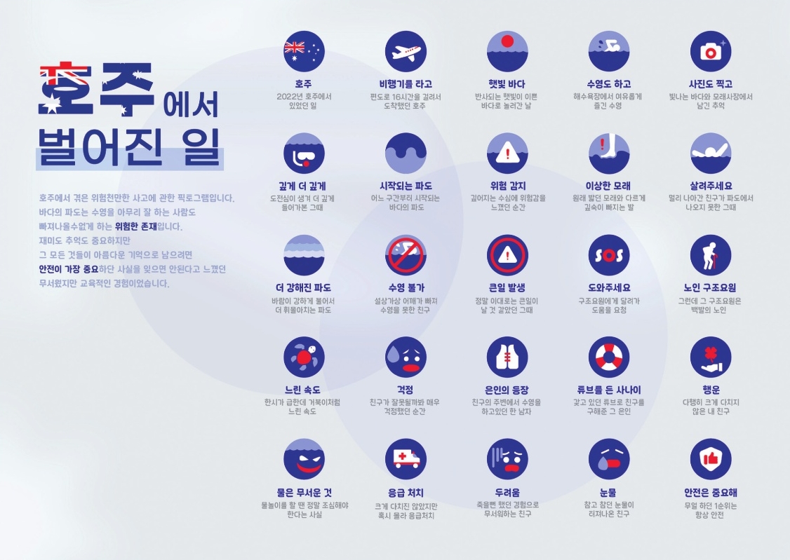 작품 설명 : 호주에서 겪었던 일을 픽토그램으로 소개한 작품입니다. 메인컬러는 블루, 레드, 화이트입니다.