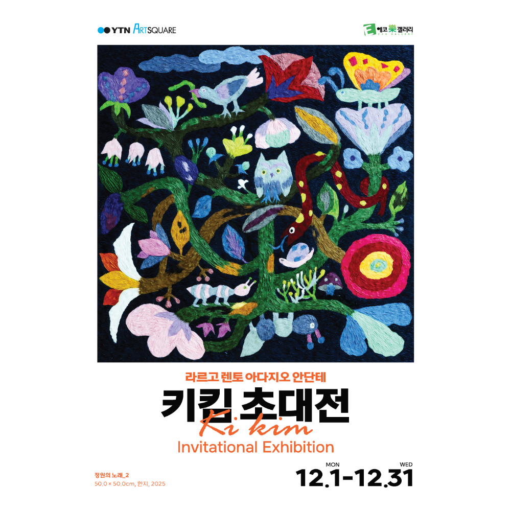 [키킴 초대전]은 에코락갤러리와 YTN 아트스퀘어가 주최하는 전시회로, 서울 마포구에 위치한 YTN 아트스퀘어에서 12월 1일부터 12월 31일까지 관람할 수 있습니다.