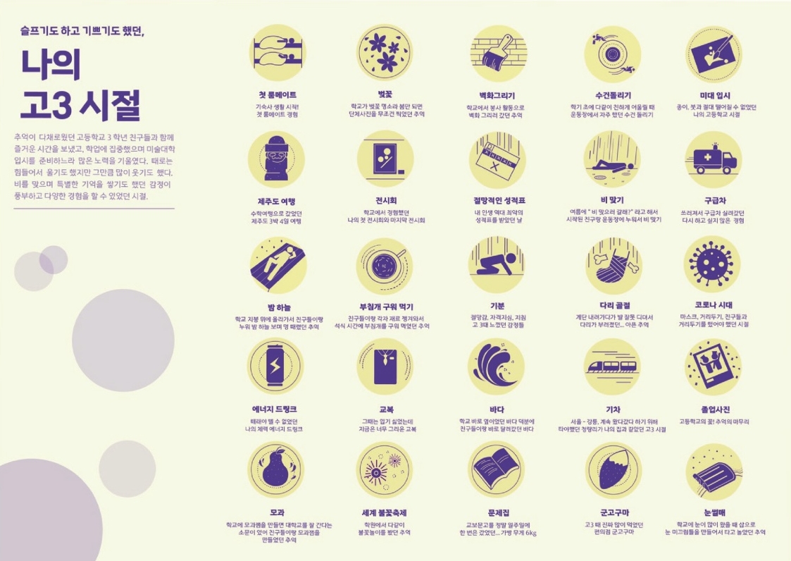 작품 설명 : 가장 힘들었지만 잊지 못할, 열정과 추억이 가득했던 고3 시절을 픽토그램으로 담아낸 이번 전시는 그 속의 다양한 감정을 시각적으로 풀어내고자 합니다. 고단함, 성취감, 불안, 그리고 소소한 즐거움까지. 이 픽토그램 속에는 청춘의 순간들이 간결한 형태로 표현되어 있습니다. 각 픽토그램은 그 시절의 한 페이지를 상징하며, 관람객들이 자신만의 학창시절을 회상하고 공감할 수 있는 공간이 될 것입니다.
